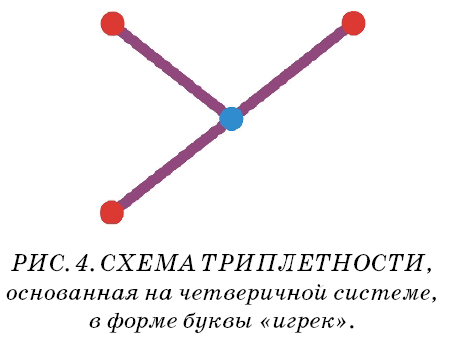 Давайте, мои дорогие, представим зрительно триплетность, основанную на четверичности. Именно по этой схеме пока работают нуклеотиды вашей ДНК. Предлагаю три нуклеотида, участвующих в создании кодона, обозначить как три красные окружности, а нуклеотид, который не участвует в создании кодона, обозначим окружностью голубого цвета. При этом наши окружности поместим в структуру буквы «игрек».