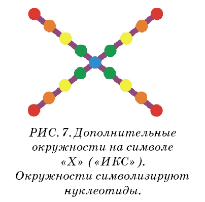 Но прежде – продолжим работу над символом, который обозначен нами буквой «Х» («ИКС») и пятью окружностями. Когда мы объединим структуру, обозначенную нашим символом, со спиралью ДНК, она станет частью спирали, в которой нуклеотиды разных кодонов оказываются связанными между собой. При этом мы размешаем на каждой из четырёх линий буквы «Х» дополнительно по три окружности, символизирующие нуклеотиды. Таким образом, на каждой из четырёх линий (отрезков), образующих наш символ, мы разместим по четыре окружности. Новые окружности окрасим в цвета оранжевый, жёлтый, зелёный – так, как это изображено на рисунке.