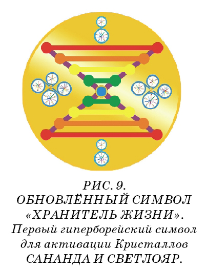 В спирали ДНК нуклеотиды связаны между собой. Так и мы на нашей схеме соединим окружности линиями соответствующих цветов. Полученную структуру поместим в золотую сферу – особую энергоинформационную структуру, которая определяет гармоничное развитие событийности. В результате образуем символ, с которым вы, как Хранители Лемурийских Кристаллов, работали во времена гипербореи. Его название – «ХРАНИТЕЛЬ ЖИЗНИ».