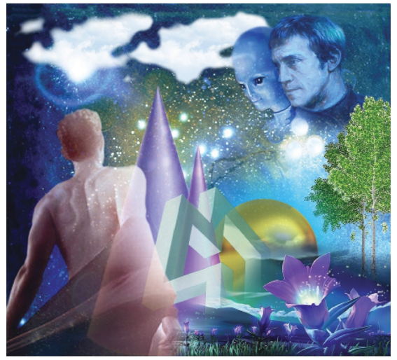 Последовав совету Владимира Семёновича, осмотрелся. То, что увидел, вполне сравнимо с поистине волшебным местом. Необычное пространство можно назвать большой комнатой сказочного дома волшебным залом. Оно имело овальную форму. Вокруг были размещены какието предметы, о предназначении которых я не знал. Шары, пирамиды, более сложные геометрические фигуры. Но, вместе с тем, росли и растения, как на открытой почве. Вот клумба изумительных цветов, а вот несколько берёз тянутся ввысь. Смотрю вверх – вижу синее небо, на нём – несколько пушистых облаков. Но в то же время понимаю, что между небом и залом есть перекрытие. Просто оно прозрачное, наверно. Журчит нежно ручеёк. Получается, пробегает прямо через наш зал... Чудеса действительно, прямо, как в сказке.
