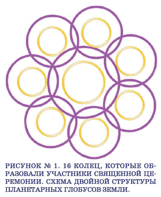 Утром, 27 июля, Священная Церемония началась. Все 9999 человек выстроились по окружностям, образовав структуру, которая вам известна как «Глобус Бога» или Схема планетарных Глобусов Земли. Всего было образовано восемь окружностей: одна в центре, семь вокруг неё. После этого внутри всех восьми окружностей мы выстроили окружности меньшим диаметром. Все участники церемонии были одеты в одеяния двух цветов – золотого и фиолетового. Таким образом, были образованы 16 колец. Внешние кольца были фиолетового цвета, внутренние – золотые (рис. № 1).