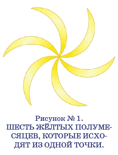 Мы обозначали с вами астральное тело жёлтым цветом… Сейчас мысленно наблюдайте, представляйте жёлтый цвет. Пусть он проявится перед вашим внутренним зрением… Перед вашими «внутренними глазами» может проявиться жёлтая сфера или просто жёлтое пятно. Продолжайте наблюдать… На жёлтом цвете вы заметите словно лёгкую паутинку. Как будто ктото начертил тонкие линии карандашом. Жёлтая сфера или просто неопределённый объём жёлтого цвета – это часть вашего астрального тела, которую вы способны обнаружить внутри своих «Я». Сосредоточьте на ней внимание… Как только вы обращаете внимание на часть своего астрального тела, оно получает энергию и начинает… трансформироваться. Сфера или пятно вдруг превращается в жёлтый полумесяц. Этот полумесяц словно оживает, начинает создавать свои фракталы… Видите? Всего образуется шесть полумесяцев, которые выстраиваются по окружности. Полумесяцы подобны изогнутым лучам, которые исходят из одной точки, из одного центра (рисунок № 1, стр. 48).