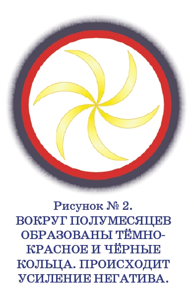 Итак… Начинайте общение с тем, кто вам неприятен. Слушайте, что он говорит вам. Он передаёт вам энергоинформацию, которая неприемлема для вас! А сейчас смотрите, что происходит с самим красным кольцом вокруг жёлтых полумесяцев. А также прошу обратить внимание на то, что вокруг красного кольца образуется ещё одно кольцо. И оно – чёрного цвета. Чем сильнее ваш негатив, тем темнее внешнее кольцо, тем шире слой образуемой темноты… (Рисунок №2).