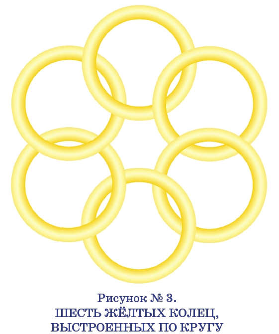 Забываем на время о жёлтых полумесяцах, о красных и тёмных кольцах… Активируем новое пространство в вашем астральном теле. Теперь уже шесть жёлтых колецторов выстраиваются по кругу, пересекаясь между собой (Рисунок № 3).