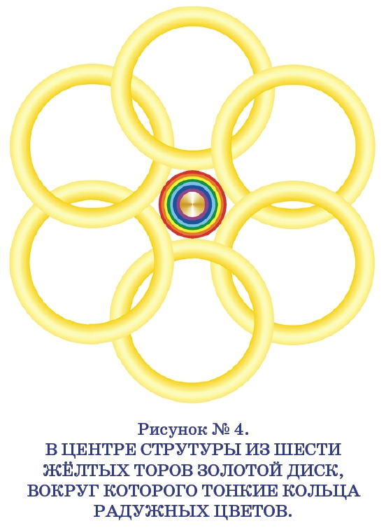 Если кольца не выстраиваются, помогите им это сделать. Мысленно прорисуйте их на своём «внутреннем экране». И наблюдайте… В самом центре этой астральной структуры обязательно появится… Золотой Диск. Это – сакральное пространство вашего астрального тела, через которое поступает к вам Энергия Любви. Эта энергия приходит к вам и по другим внутренним энергоинформационным Каналам. Но этот центр для вас сейчас наиболее важен! Активируйте его своим чистым намерением! И вы увидите, как вокруг золотого диска образуются кольца радужных цветов (рисунок № 4, стр. 52).