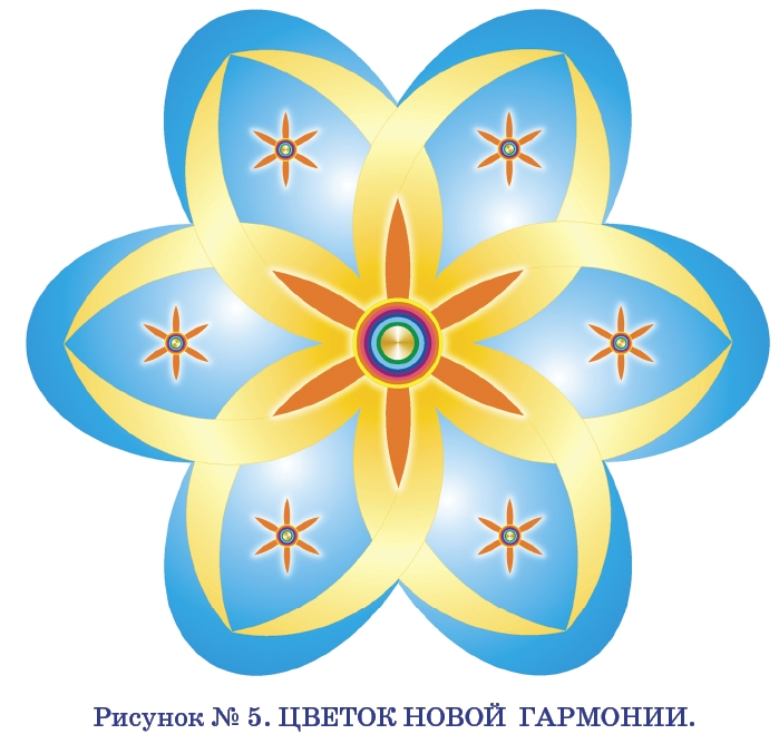 Да, вы испытывали ненависть, злобу, страх. Вам знакомы многие негативные чувства. Но теперь… мы убираем ТЕСНУЮ СВЯЗЬ ВАШЕЙ АСТРАЛЬНОСТИ С ФИЗИЧЕСКОЙ МАТЕРИЕЙ. Мы убираем красное кольцо вокруг полумесяцев… Убираем тёмноё кольцо вокруг красного. И теперь… Объединяем свои полумесяцы, гармоничные полумесяцы, с полумесяцами негармоничными – теми, которые живут в Нелюбви. Одни жёлтые полумесяцы двигаются навстречу другим. И соприкасаются. Потом мы наполняем шесть жёлтых колец, объединеных между собой, энергией голубого цвета. Это Новое Сердце Времени преподносит свой дар для ваших астральных тел. При этом жёлтые кольца постепенно окрашиваются в голубой цвет. Они трансформируются, вытягиваются, становятся по форме похожими на лепестки Цветка… Голубой цвет проникает внутрь.. Полумесяцы входят внутрь лепестков. Смотрите, наблюдайте. Ведь на самом деле рождается какойто чудесный Цветок! В центре его – золотой диск, излучающий радужную энергию. А от радужного Кольца исходят шесть оранжевых лучей. С их помощью ваша астральная материя связывается с ментальной материей. Ваша прекрасные чувства порождают гармоничные мысли… Теперь поместите золотой диск с радужным кольцом в центр каждого голубого лепестка, между двумя полумесяцами. И почувствуйте, как внутри вас потечёт приятная, нежная, очень гармоничная энергия. Новая астральная структура внутри вас рождена! Вас приветствует Цветок Новой Гармонии.