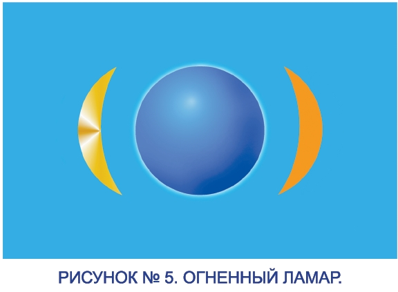 И потом, когда сотворите эти торы, просите ваши тонкоматериальные Группы Поддержки направить в эти торы астральные и ментальные программы исцеления. В жёлтый тор – астральные программы. В оранжевый тор – ментальные программы. А потом – подождите, когда этот процесс завершится. Энергии начнут стихать. После этого ваша задача – переместиться… в ОГНЕННОЕ ТЕЛО. Для этого выражайте чистое намерение и… углубляйтесь в сияющий синий свет. И теперь очень важно родить в сердце искреннюю любовь к своему «Я» и ко всему, что вас окружает. Главный Закон Любви – любить всё окружающее и своё «Я». Этот закон просто сформулировать. Но сложно выполнить – вам, людям, живущим в мире плотной материи, где много негармонии и нелюбви. Но стремиться выполнить этот закон вы призваны. В том числе вы призваны любить своё физическое тело. Любая нелюбовь в мыслях, в чувствах, в устремлениях, в действиях или в бездействиях – это путь к нарушению Закона Любви и это – путь к заболеваниям вашего физического тела, к боли. Находясь в огненном теле, вы можете призвать к сотворчеству ваш любимый Космический Огонь, вы можете призвать к сотворчеству все космические Огни – ведомые и не ведомые вам. Они помогут сотворить для вас программу исцеления от того или иного заболевания, они помогут исцелиться от боли. Сотворяйте программу исцеления вместе со своим Высшим «Я», Божественным «Я». Вы почувствуете, что внутри вас идут энергии, и эти энергии начинают концентрироваться, образуя сферу. Это – синяя Сфера исцеления, которая сейчас проявляется внутри вашего огненного тела. Помещайте слева от сферы (в сторону вашей левой руки) золотую мембрану в виде полумесяца, а справа (в сторону вашей правой руки) – оранжевую мембрану в виде полумесяца. И наблюдайте, чувствуйте, как образуется единая энергоинформационная система, которая называется ОГНЕННЫЙ ЛАМАР (рисунок №5). Это – собрат, сотворец уже известного вам Белого Ламара.