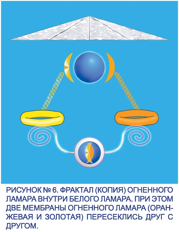 Как только Огненный Ламар будет готов к работе, над ним образуется серебристая структура, по форме напоминающая купол, верхнюю часть зонтика. У этой структуры – восемь граней, которые содержат программу восьми основных характеристик огня, необходимых для рождения программ исцеления астрального, ментального и физического тел человека. Её можно назвать СЕРЕБРИСТОЙ ОГНЕННОЙ МЕМБРАНОЙ (рисунок №6). После этого от золотой и оранжевой мембран Огненного Ламара начнут испускаться импульсами волны. Эти волны направятся к жёлтому и оранжевому торам, которые вы проявили раньше. От огненного тела пойдут программы исцеления для астральной, ментальной, тонкой физической и плотной физической материй. В результате образуется единая энергоинформационная система, которая объединит Огненный Ламар и Белый Ламар. Как вы помните, ваш Белый Ламар в это время находится в области одного из позвоночников.