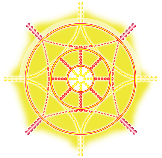 Линзы, направленные внутрь центра – золотые, напоминают о глубине познания Бога. Линзы, внешне направленные – красные, напоминают о человеческой общественно-социальной природе, которая имеет не менее важную роль в раскрытии Души.