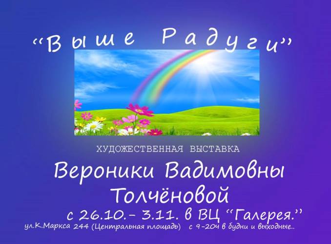 От всей души благодарю Веронику Толченову за те непередаваемые волшебные чувства, которые я испытала, глядя на ее картины. Искренние, чуткие, неожиданные, волнующие, свидетельствующие о богатой духовной жизни художника, любящего жизнь и наполняющего свои творения теплотой, любовью и светом.