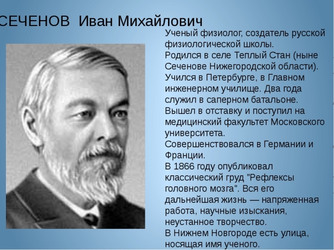 *Ива́н Миха́йлович Се́ченов (1829—1905) — русский просветитель, медик, биолог, физико-химик, приборостроитель, действительный статский советник, заслуженный профессор Московского университета, член-корреспондент (1869), почётный член Санкт-Петербургской академии наук (1904), один из основоположников психологии, создатель физиологической школы (ВИКИПЕДИЯ).