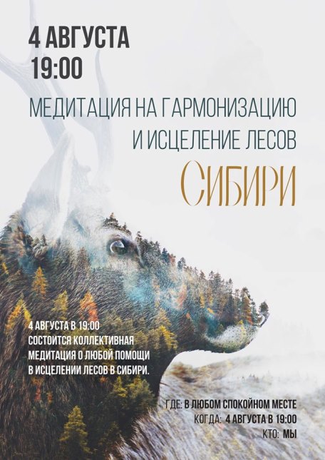 Завтра состоится всероссийская медитация на гармонизацию и исцеление лесов Сибири. Ждем тебя в едином целительном пространстве 4 августа в 19:00