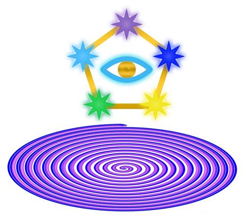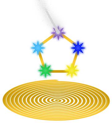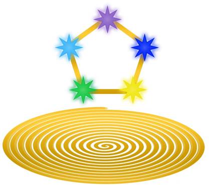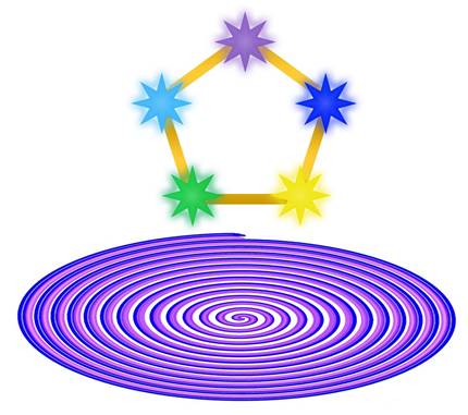 РИСУНОК № 4. ПЯТЬ ВОСЬМИЛУЧЕВЫХ ЗВЁЗД – жёлтая, зелёная, синяя, голубая и фиолетовая – соединяются с помощью золотых лучей в пятиугольник. Пятиугольник располагается над сине-фиолетовой спиралью.