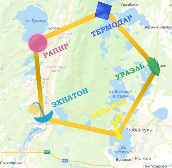 Ну а пока – сообщу о местоположении других кристаллов основных. Пятиугольник – форма всей системы. Кристаллы вспомогательные Рахии находятся внутри. Кристаллы основные - на вершинах. Одна вершина, где проявлен Акваром, граничит с озером прекрасным, что Чебаркулем нарекли.