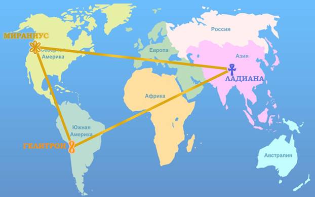 РИСУНОК № 20. Места материальных привязок трёх Лемурийских Кристаллов – ГЕЛИТРОНА, ЛАДИАНЫ, МИРАНИУСА – древних кристаллических форм жизни, оказывающих влияние на эволюцию земного мира более тридцати тысяч лет назад.