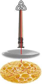Андора начинает раскручивать спираль стебля, образуя постепенно канал, заполненный Волнами Первотворения… Они уверенно устремляются в сторону Иерусалима, образуя в пространстве цепочку, в «окнах» которой проявляются, по очереди, то Золотое Солнце, то фиолетовый Скрипичный Ключ! (Рис. № 6). Волна быстро доходит до назначенного места, и начинает взаимодействовать с негативной символикой Портала. Это приводит к преображению символов, которые меняют своё содержание и приобретают светимость. Более того, они обретают способность звучать в том диапазоне частот, который благотворно станет влиять на людей. После этого Волна Первотворения спускается по четырём «отросткам» в основную структуру Портала (Рис. 11).