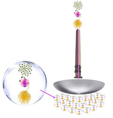 Постепенно структура Портала меняется, и вы видите сейчас её в обновлённом виде: вместо линз появляется цветок интенсивно синего цвета. Три лепестка большого размера, а между ними три лепестка в 2 раза меньше. Что же произошло с той субстанцией, которая заполняла «столб»? Она сначала свернулась, стала как бы густой и вязкой, а потом вмиг преобразилась, сформировав вертикальный эллипсоид, похожий на нераскрывшийся бутон цветка. Более того, исчез «столб», а вместо него появилась чашечка, нежно обхватывающая бутон. Бутон имеет бледно-розовый цвет, а чашечка нежно-зелёного цвета. (Рис. 18)