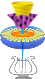 Перенесите две голограммы ливадийского артефакта в первый энергоинформационный центр Кристалла, в центральное отверстие тора. Пусть одна голограмма встанет голубым шпилем вверх, ко второму энергоцентру. А вторая голограмма, зеркально отражённая, пусть смотрит вниз, и её голубой шпиль коснётся арфы (Рис. № 15).