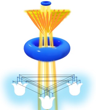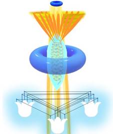 Труба Портала, имеющая квадратное сечение, начинает округляться, постепенно превращаясь в тор – сияющий тор золотистого цвета! «Отростки» становятся также небольшими торами, и их на основном торе вы видите уже не четыре, а шесть. Над этой новой конструкцией появляется полусфера в форме чаши, и вся преображённая символика располагается на ней. Вся Площадь перед Храмом наполняется гармоничным звучанием Кристалла Андора! Портал преобразован! (Рис. № 12)