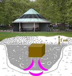 Портал находится ниже уровня земли на 1 км. Состоит из трёх вогнутых линз, расположенных в одном уровне, образуя треугольник. Выше этих линз расположен квадратного сечения «столб». Невысокий, около 50 см. Сторона квадратного сечения 60 см. Этот «столб» внутри полый и содержит желеобразное вещество, хорошо поглощающее позитивного характера энергии, и усиливающее энергии негативные. «Столб» передаёт негативные энергии линзам для концентрации и излучения. (Рис. №17)