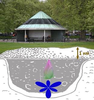 Он представляет по своей структуре вогнутый овал, фокус которого расположен под обелиском. Ниже этого вогнутого овала находится устройство, усиливающее негативные энергии огромного количества приезжающих сюда людей, к которым добавляются специально создаваемые энергоинформационные пакеты в самом Ватикане. Это устройство представляет собой разного размера ячейки, которые объединены единой нитью, протянутой через фокус овала в обелиск, к его верхней точке. Сам овал имеет тёмно-серебристый цвет, напоминающий минерал гематит. Ячеистая структура – жёлтая, а нить – красная, заканчивающаяся на вершине обелиска излучателем. Он похож на трилистник. (Рисунок № 5)