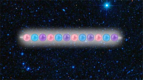РИСУНОК № 40. ЧУДЕСНАЯ СВЕРКАЮЩАЯ СЕРЕБРЯНАЯ НИТЬ В ПРОСТОРАХ КОСМОСА. НА НИТИ – РОЗОВЫЕ, ГОЛУБЫЕ И ФИЛЕТОВЫЕ БУСИНКИ, излучающие белый свет.