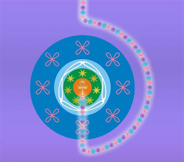 Вновь обращаем внимание на Кристалл Мирта. А именно – на его центральную оранжевую сферу, внутри которой располагается золотой анкх. От нижней части анкха проводим сверкающую серебряную нить вниз, выходим за пределы кристалла, то есть за пределы внешнего тора, и начинаем двигаться вверх – по направлению часовой стрелки. Достигнув самой верхней части тора, тянем нить вверх, выше и выше…