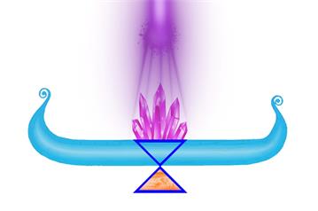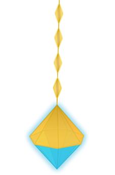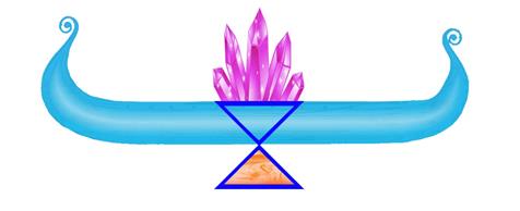 Белый свет проявляет форму этого Кристалла. И мы наблюдаем его как голубую чашу, из которой произрастают пять кристаллических стержней розового цвета. Три стержня размером побольше, и два, по бокам, меньшего размера. Ниже расположена синяя структура, по форме напоминающая песочные часы. Верхняя часть этих часов, находящаяся внутри чаши, словно пустая, а нижняя, выходящая за пределы чаши, наполнена оранжевой энергетической субстанцией.