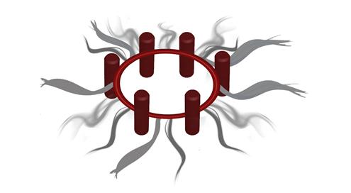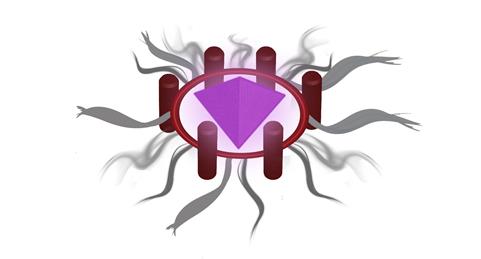 Представьте четвёртый негативный энергоинформационный Портал, созданный Силами Сдерживания, как шесть тёмно-коричневых столбов в форме цилиндров, расположенных по окружности. Эти цилиндры опоясывает тёмно-красное кольцо. От кольца во все стороны излучаются серые волны.