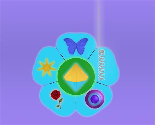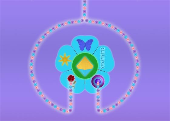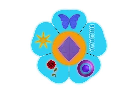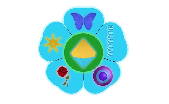 Белый свет проявляет форму этого Кристалла. И мы… наблюдаем его как цветок с пятью голубыми лепестками. В центре – ОРАНЖЕВАЯ СФЕРА, а внутри неё семигранная бипирамида фиолетового цвета. В центре каждого из пяти лепестков структуры, которые способны образовывать те или иные виды пространственно-временных порталов. В первом лепестке, самом верхнем, расположена структура в виде КРЫЛЬЕВ БАБОЧКИ синего цвета. Движемся по кругу, направляясь по часовой стрелке, и наблюдаем, что в следующем лепестке проявлена структура в виде голубой спирали из 13-ти витков. В третьем лепестке обнаруживаем структуру в виде ТРЁХ СФЕР, расположенных по принципу матрёшки. Меньшие сферы расположены в больших по размеру. Самая маленькая сфера – синяя, затем – голубая, внешняя сфера фиолетовая. В четвёртом лепестке – структура, похожая на алую розу. В пятом лепестке – СЕМИЛУЧЕВАЯ ЗОЛОТАЯ ЗВЕЗДА.