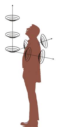 Проявив вертикальную ось воронок, вновь выражаем чистое НАМЕРЕНИЕ, на этот раз: заякорить горизонтальные ВОРОНКИ ПАМЯТИ ПАРУСА МАЙТРЕЙИ. Они отходят от вертикальной оси вправо и влево (в сторону правой и левой руки человека), образуя своеобразные крылья перед корпусом человека.