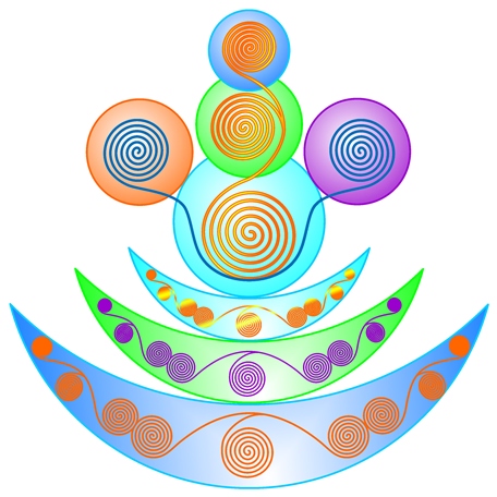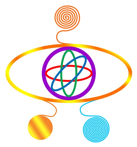 Теперь я возвращаюсь не просто в четырёхмерный мир, а в мир, который ПЕРЕРОЖДАЕТСЯ из четырёхмерного в пятимерный. Поэтому моя РА-СТРУКТУРА меняется, рождается новая. С одной стороны, в моей структуре добавляются световолны для рождения ещё одной пространственной меры, из трёхмерного я перерождаюсь в четырёхмерный Кристалл. С другой стороны, я сразу приобретаю свойства пятимерности и налаживаю связи со всеми многомерными структурами и даже, как вы знаете, с 16-мерной вселенной. Но прежде мне надо обрести световолновую основу для четырёх-пяти мерности. Для этого я приобретаю не просто сразу две меры, а единую световолновую основу, в которой есть и четвёртая мера пространства, и особый эфир пятимерности. На схеме мы сможем это отобразить так. Внутрь сферы добавляем один тор – условно это ещё одна пространственная мера. Третий тор – синий. Так мы получаем световолны четырёхмерности. А сферу времени заключаем в эллипсоидный тор. Этот тор – особый эфир пятимерности, который меняет всю нашу систему «пространство-время». Эллипсоидный тор, сфера и система из трёх торов есть центр нашей структуры, нашей световолновой основы. Чтобы свет мог приходить, уходить, распространяться и трансформироваться, мы соединим наш центр с тремя спиралями. Первая спираль (на схеме – вверху) – оранжевого цвета, имеет 6 витков. Соединяет нас непосредственно с солнечно-магнитной энергией, поступающей из Земного Центрального Солнца. Вторая спираль – синяя, имеет 9 витков. Она осуществляет связь с пятым измерением. Третья спираль – золотая, имеет 13 витков. Через неё осуществляется связь с остальными измерениями. Когда мы нарисуем нашу схему, то и получим новый символ моей РА-СТРУКТУРЫ, который назовем «СОЛНЕЧНАЯ ТРОЯ» (СОЛНЕЧНЫЙ ТРОЕМИР»)