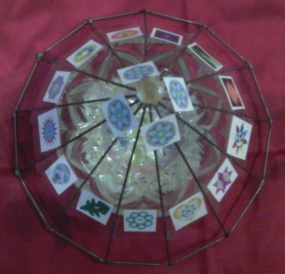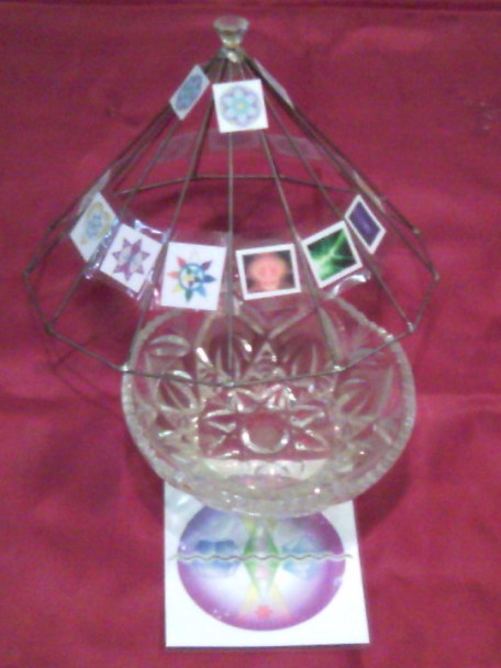 Давно, еще до начала Проекта «Вознесение» я смастерил тринадцатигранную пирамиду. Когда пришли Огни Вознесения, я символы установил на пирамиду, и получился Венец Огней Вознесения. Наверху - символы Кристаллического Венца Огней Вознесения для материализации энергий. Потом по Крайону я создал Алтарь для Воды - хрустальная ваза с восьмилепестковым цветком (это тоже было давно).