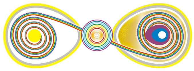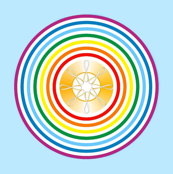 Палестина вам уже рассказала об одновременном сотворчестве двух Вселенных. Вам известно, что сейчас в вашей жизни, и в жизни Земли, происходят уникальные процессы, инициированные двумя Великими Центральными Солнцами – ВЦС 13-ти мерной Вселенной, и ВЦС 16-ти мерной Вселенной. Нужно сделать так, чтобы сотворяемый нами инструмент подпитывался бы постоянно этими двумя ВЦС. Что же мы делаем? Всё очень просто. Вспомните символ «Кисти Счастья», который уже активирован в ваших Сакральных Сердцах. В центре НТ-20 сияют эти два ВЦС. Внутри помещается сакральное Солнце 16-ти мерной Вселенной (белая сфера), а снаружи – золотая сфера 13-ти мерной Вселенной. Мы можем смело поместить этот символ двух сакральных Центров Вселенных в сотворённую нами радужную сферу.
