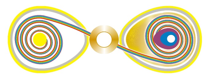 - «КИСТИ СЧАСТЬЯ». Напоминаю вам, что эта структура состоит из двух космических яиц 13-ти мерной Вселенной (на рисунке 3 слева) и 16-ти мерной Вселенной (на рисунке 3 справа), и они объединены с помощью Нулевой Точки -20, радужные нити-лучи которой переносят всё, что необходимо для энергоинформационного обмена и развития пространства-времени. В центре структуры «КИСТИ СЧАСТЬЯ» находится сфера в сфере, белая -внутри золотой. Это энергоинформация ВЦС 16-ти мерной и 13-ти мерной Вселенных. Энергия 16-ти мерной Вселенной более глубинная, сакральная, поэтому она расположена в белой сфере внутри золотой.