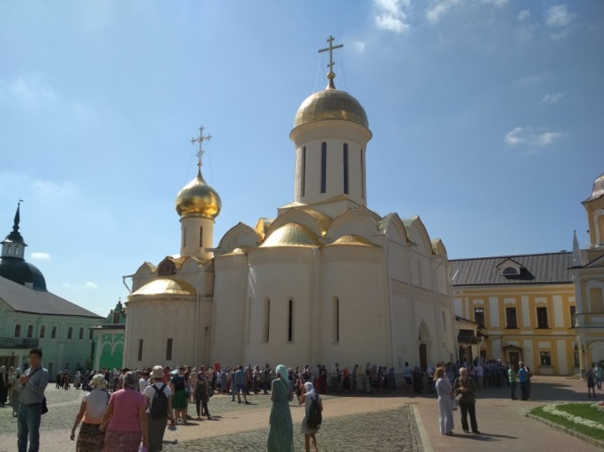 По территории Троице-Сергиевой Лавры мы направляемся к Троицкому собору, где находятся мощи Сергия Радонежского. Встали в длинную очередь.