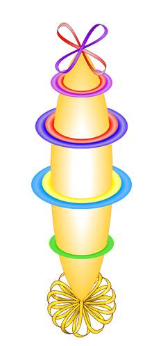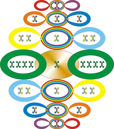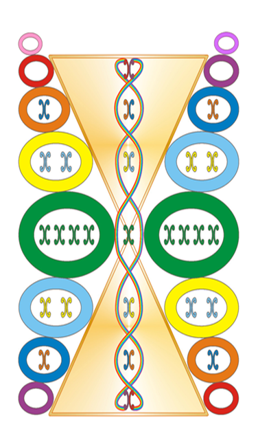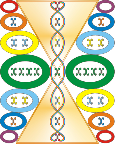 Если двигаться по символу «ОКО САВАОФА» снизу вверх, то первый ряд торов - психические материи 4 и 5 измерения, далее торы темпоральных и астральных материй 4 и 5 измерения, третий ряд торов – огненные и ментальные материи 4 и 5 измерения, и верхний ряд торов - эфирные и физические материи 4 и 5 измерений.