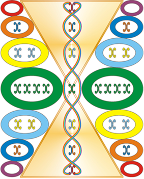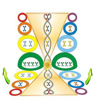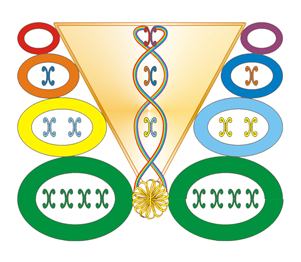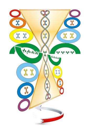 Берём за уголок нижний треугольник и поворачиваем его мысленно против часовой стрелки (слева направо) на 180 градусов, а повернув, совмещаем нижнюю и верхнюю части треугольников. Для этого мы поднимаем нижний треугольник за основание вверх. И что мы видим? Наложились один на другой два треугольника, и совместились материи 5-ого и 4-ого измерений через нуль-пространственный переход с помощью Золотого Кристалла Истинного Времени. Радужные спирали (одна нить - семь видов материи четырёхмерности и вторая нить – семь видов материи пятимерности), объединяющие полимирные гены, накладываются друг на друга. Получается структура – Треугольник (а вернее конус, вершиной вниз, при этом вершина упирается в Золотой Кристалл Истинного Времени) (Рис.4).
