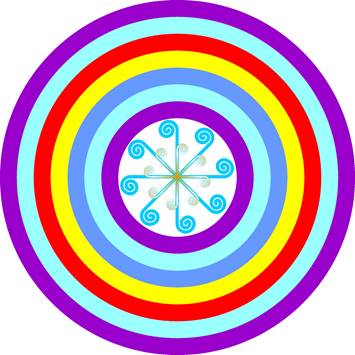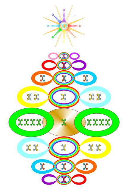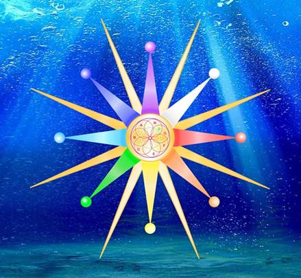 В центр Вифлеемской звезды помещена золотая сфера, в которой живут все восемь Глобусов нашей планеты Земля. Золотая сфера –это наше Великое Центральное Солнце, и оно вспыхивает яркими лучами, которые прорастают между восемью радужными Лучами.