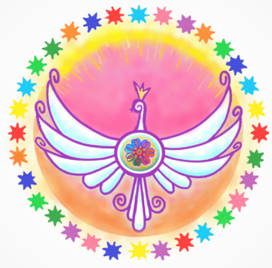 В центральной части символа на фоне восходящего Солнца изображена поющая Белокрылая Птица. Птица олицетворяет светлую Душу, летящую на световолнах – крыльях со множеством Нулевых Точек и своей волшебной песней (Музыкальной Струной), соединяющую Небо и Землю, 13-мерную и 16-мерную Вселенные.