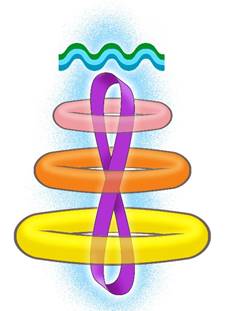 Эта волна трансформируется в четырёхмерии в микрочастицу, которая представляет собой микроструктуру, сотворённую из трёх витков трёхцветной спирали (зелёная, голубая, синяя) и трёх торов, один из которых (в основании) размером побольше, другой – меньше, третий ещё меньше. Торы – жёлтый (в основании), оранжевый – в середине, розовый – сверху. В итоге образуется конусовидная конструкция. Внутри конструкции – вертикальная лента Мёбиуса в виде восьмёрки фиолетового цвета. Так реализуется код 33-18 (ЯР). Первая 3 – это три витка спирали, где идёт взаимодействие психической, темпоральной и огненной материй. Вторая 3 – это три тора, где осуществляется взаимодействие астральной, ментальной и тонкоматериальной физической материй. Лента Мёбиуса (8) поддерживает единство (1) всей структуры благодаря Эфиру.