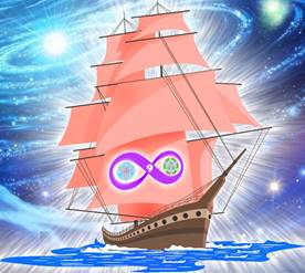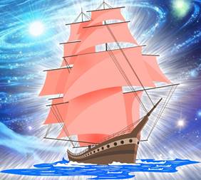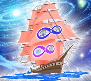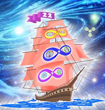 Направляем энергию из нашего сердечного пространства в центр Алтаря. Мелодия флейт начинает звучать, арфы вторят переливами, Алтарь сияет, как Звезда, вокруг приходит в движение пространство и время – все энергии причудливо переплетаются и над Алтарём постепенно проявляется символ… Да это же наша Каравелла! Она так же невесомо скользит по необозримым просторам Пространства-Времени, путь ей указывает Огненная Вишну Арджуна, на парусах красуются объединённые символы программ Эвридики и Меркурия, а на самой высокой мачте развевается фиолетовое полотнище флага-вымпела с объединённым кодом всех шести программ. Код этот образовался в результате сложения общих кодов программ, соединённых попарно: 9+6+7 = 22.