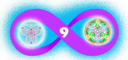 Вокруг символов возникает лента Мёбиуса Фиолетового цвета. (Мы понимаем, что именно она может обеспечить квантовый переход к принципиально новому состоянию Генома). Лента выгнулась в виде горизонтальной восьмёрки, и над ней высветились коды активации этой пары программ: «364» и «311». Цифры внутри кодов пришли в движение, складываясь между собой: 3+6+4=13=1+3=4; 3+1+1=5. Итоговые цифры соединились (4+5) и в месте пересечения петель ленты Мёбиуса вспыхнул общий код этой пары программ: 9