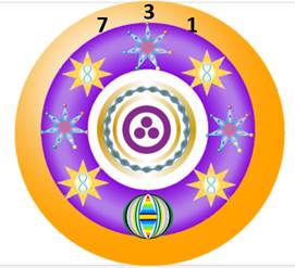 В центре размещён символ Трёх Звёзд Пояса Ориона: Альнитак, Альнилам, Минтака, помещён в 13-й слой, который подчёркивает связь с Космосом (Макромиром). Энергоинформация, идущая от этих Звёзд через Чинтамани, несёт особые программы полимирности для многомерного Генома и гена.