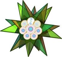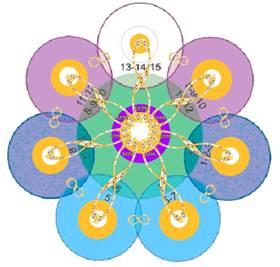 В лепестках справа от центральной Звезды в символе изображены КМТ 5-ти мерности, принимающий через магнитные поля программы восьмеричности от ВЦС 13-ти мерной Вселенной (средний лепесток) и от Кристаллического Сердца Земли (большой лепесток справа). КМТ 5-ти мерности выстраивает связи с КМТ 4-х мерности (в малом лепестке восьмёрки слева).