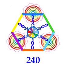 Код 111 или 1-3 – это проявление четыреплетности кодонов для восходящей ветви. При наложении 3-х оранжевых витков нисходящей ветви на 10 фиолетовых восходящей ветви и их соединении в центре, осуществляется передача генетических кодов от нисходящей ветви к восходящей. Происходит их слияние, скрещивание.