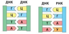 Нуклеотиды способны формировать парные комплексы Аденин - Тимин (или Урацил в РНК) и Цитозин - Гуанин. Молекулы этих оснований соответствуют друг другу по размерам и расположению атомов. Такое соответствие называют комплементарностью. И это уже комплементарность на физическом плане. Такое взаимодействие играет ключевую роль в ряде фундаментальных процессов хранения и передачи генетической информации. В ДНК две цепи удерживаются вместе за счёт водородных связей между нуклеотидами А-Т, Г-Ц. При переписывании информации о структуре белка с ДНК на РНК, запись идёт в строгом соответствии с комплементарностью и на РНК против Аденина (в ДНК) становится комплементарный Урацил, а против Гуанина – Цитозин и