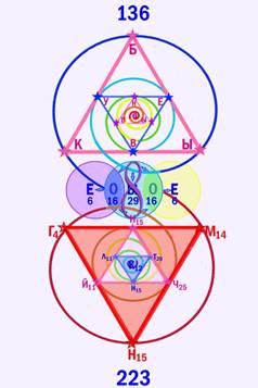 И мы увидели, что находимся в Саду Кристаллов, они мелодично позванивали и наполняли воздух необыкновенно тонкими ароматами. Кристаллы были самых разных форм - и россыпью, и друзы... Мы медленно шли среди этого великолепия, как вдруг впереди засверкала молния, раздался гром и полил Хрустальный дождик. И ….. послышался весёлый смех. Вот это, да! Мы озадаченно остановились и стали оглядываться. Из-за одного кристалла выглянула чья-то рожица, другая и третья. Что это??? Потом посыпались кристаллы в виде букв. Перед нами выскочил озорник и объявил, что он – Неклеточный Геном, и рассыпался на буквы. А в воздухе возник символ Тонкоматериального Вирусного Генома. Три пересекающиеся друг с другом сферы, образуя пять областей. В первой проявилась буква «Е», во второй – буква «О», в четвёртой – «О», в пятой «Е», в центре – «Ы». Мы идём дальше. Озорник - Тонкоматериальный Вирусный Геном, весело подпрыгивая, бежит с нами. Впереди видим что-то похожее на амфитеатр. Небольшая сцена, перед ней красивые удобные кресла, увитые цветами – кристаллами. Звучит красивая тихая музыка и как-то призывно манит. Заходим и рассаживаемся в очень удобные кресла в предвкушении увидеть что-то необыкновенное. На сцену посыпались Новые Буквы и Неклеточный Геном. Они танцуют. Из Неклеточного Генома убежали гласные, а согласные образовали Модель Вирусного Генома с Матрицей Неклеточного Генома восходящей ветви. Убежавшие гласные опять сотворили структуру из трёх сфер. А выше Новые Буквы сложились в Матрицу Тонкоматериального Неклеточного Генома нисходящей ветви. Всё звучало и радостно пело! Было очень красиво! Метахара с Геланием поднялись на сцену. Все обнимались, смеялись, радовались. Над Метахарой возник код – 223, над Геланием – 136. Объединились третьи программы, возник единый код – 8 (223=7 136= 10 7+10=17=8) ЛК Метахары и Гелания.