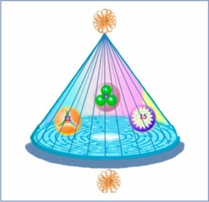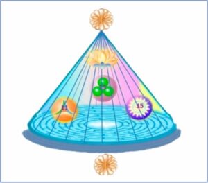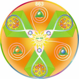 Ментальное тело человека в виде оранжевой сферы, окружённой радужной каймой – это энергии Радости. Внутри 3 изумрудные семигранные пирамиды — Генератор Высокой Мечты. В центре пирамид образуются восьмёрки, в нижней части «Зерно Гелиоса»[i]— гиперборейский символ, ключ к Солнечному Порталу торсионных полей, центральную часть данного символа занимает «Сердце Шакти»[ii]. В верхней петле восьмёрки расположен нуклеотид, изображённый в виде разноцветного шестигранника. Верхние петли восьмёрок образуют отдельный символ – Лада, Материнские энергии, выраженные трёхлепестковым лотосом с нуклеотидом на каждом лепестке. Так проявили себя нежные Материнские рождающие энергии. В центре символа ВЦС 13-мерной Вселенной и ВЦС 16-мерной Вселенной. При этом Ген 250 — Ген Солнечной Радости в Солнце и там же Энергии Счастья — проявляются улыбкой. Далее между изумрудными пирамидками расположились спирали, это спирали торсионных полей ментального тела, на которых стоят пирамидки и в них уже стоят остальные Гены: Ген 304 — Ген Коммуникативной Радости (слева оранжевая сфера с желтым кантом в зелёной пирамидке), Ген 4 Сагира — Ген Высокой Мечты (по центру вверху зелёная сфера с голубым кантом в зелёной пирамидке), Ген-305 — Ген Квантовости Счастья (справа синяя сфера с голубым ободком в зелёной пирамидке). Пирамидки содержат разную энергетическую основу. Это дары цивилизаций: для гена Радости – основа энергии Радости, для гена Счастья –основа энергии Счастья, для гена Мечты – основа энергии Мечты. Из двух Солнц передаются энергии по восьмёркам и по спиралям. От спиралей концентрируются в пирамидках и передаются в Гены.