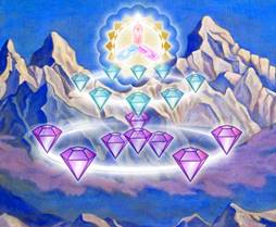 Елена, Николай и Юрий Рерихи торжественно цепь кристаллическую Огненную оживляют: Кайлас, центр Шамбалы, - с Белухою, с долиной Каракольской и всем Алтаем соединяют. Спираль образовалась вмиг, кружится против стрелки часовой, всё очищая и преображая в долине многовековой. Вдруг видим, как меняется вращение энергетической спирали. По стрелке часовой пошло движенье. В одно мгновенье небо засветилось, огнями заиграло! Как радостно, светло, легко в долине стало! Свет Шамбала Небесная явила! Храм Горнiй Эдельвейс в своё пространство горнее включила! Владыки Шамбалы отныне с нами - во Всемирном Храме!